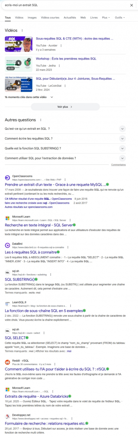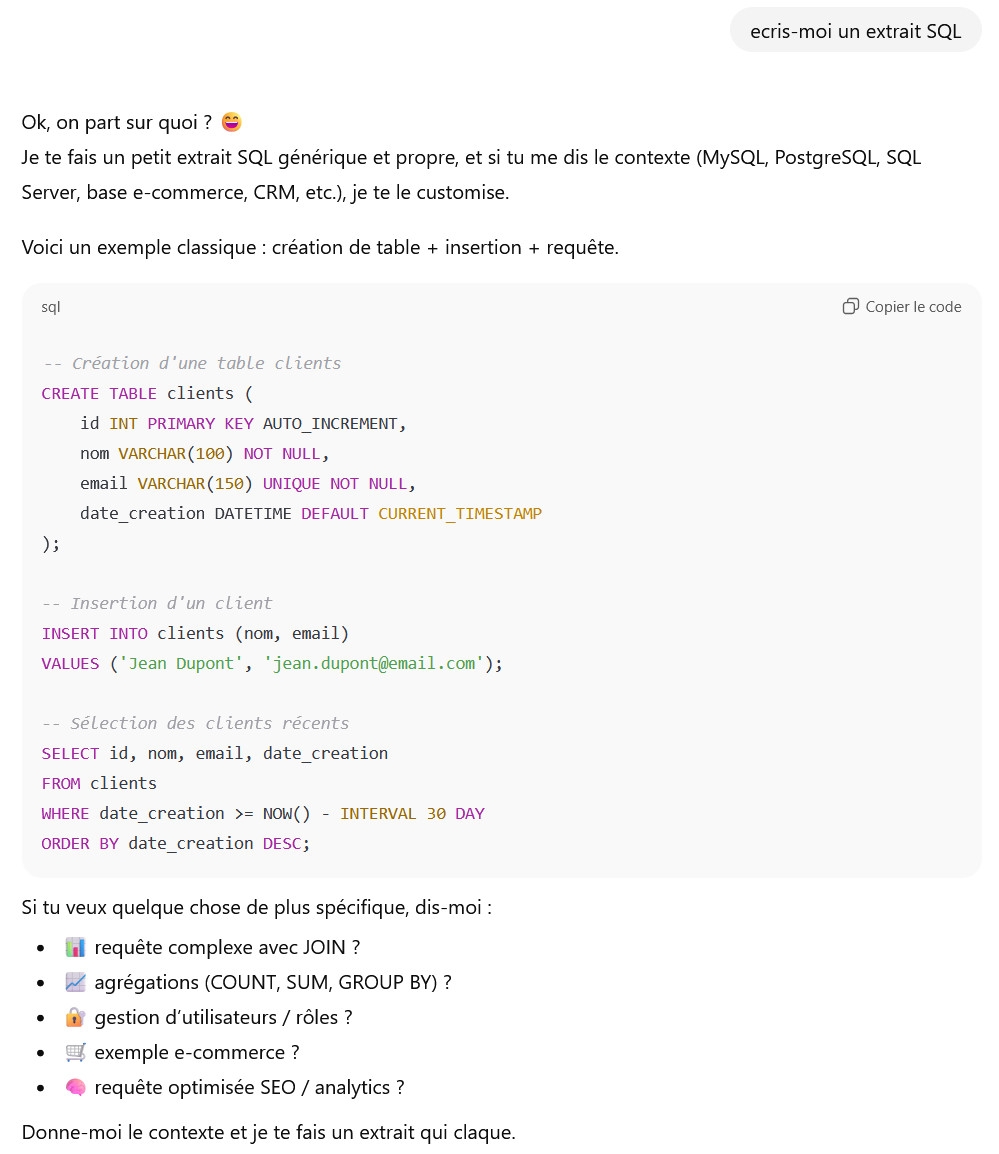 Par exemple, j’ai fait le test avec « écris-moi un extrait SQL ».