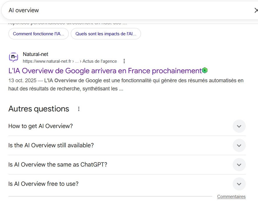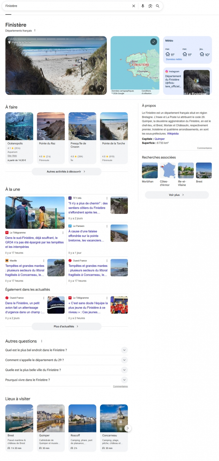 Il existe plusieurs formats d’aperçus générés par l’IA. En France, les plus courants sont les zones « Autres questions », « Vidéos », les suggestions directement dans la barre de recherche, toutes les suggestions de lieux, d’informations, etc. D’autres zones existent selon les requêtes. Ou encore les pays, ce qui est très important si votre site est multilingue.